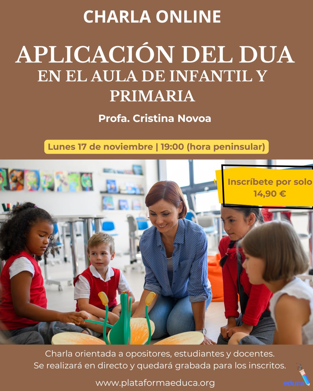 Cristina Novoa, es profesora en el CRA Domingo de Guzmán, Doñinos Salamanca. Fue finalista a los Premios EDUCA ABANCA Mejor Docente de España en dos ocasiones. Forma parte del panel docente de la Academia de Alto Rendimiento Campus EDUCA y ha sido galardonada con el Premio Nacional A3media por Metodología innovadora LAL Tics. La charla se realizará por la plataforma Teams. Todos los inscritos recibirán el enlace privado el día antes de la charla para visualizarla en directo y también podrán acceder a la grabación de la misma posteriormente durante un mes. La charla tendrá una duración de 60 minutos. Inscripciones hasta el 14 de noviembre.